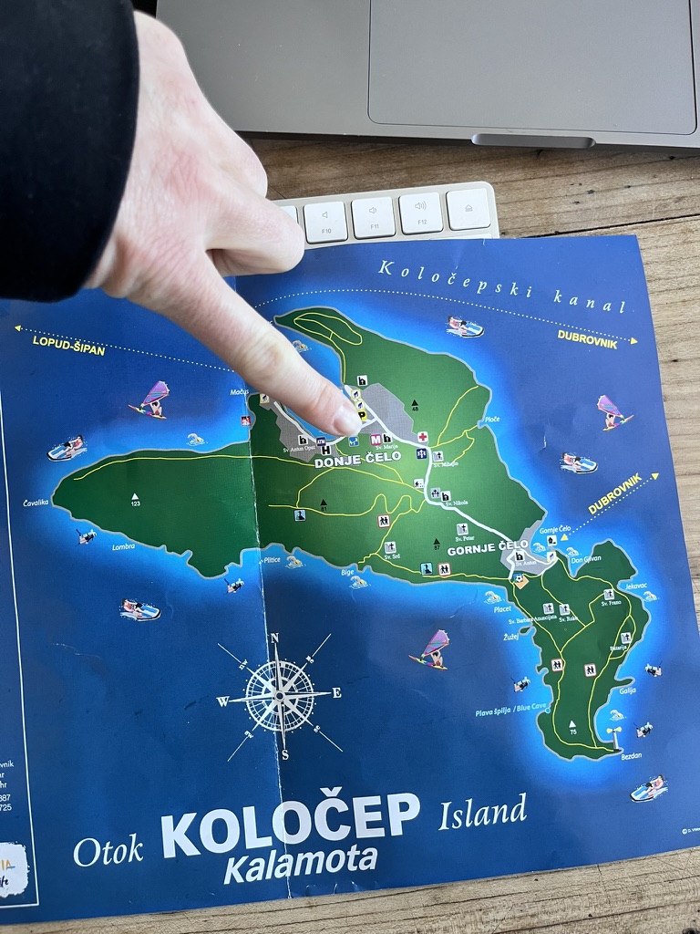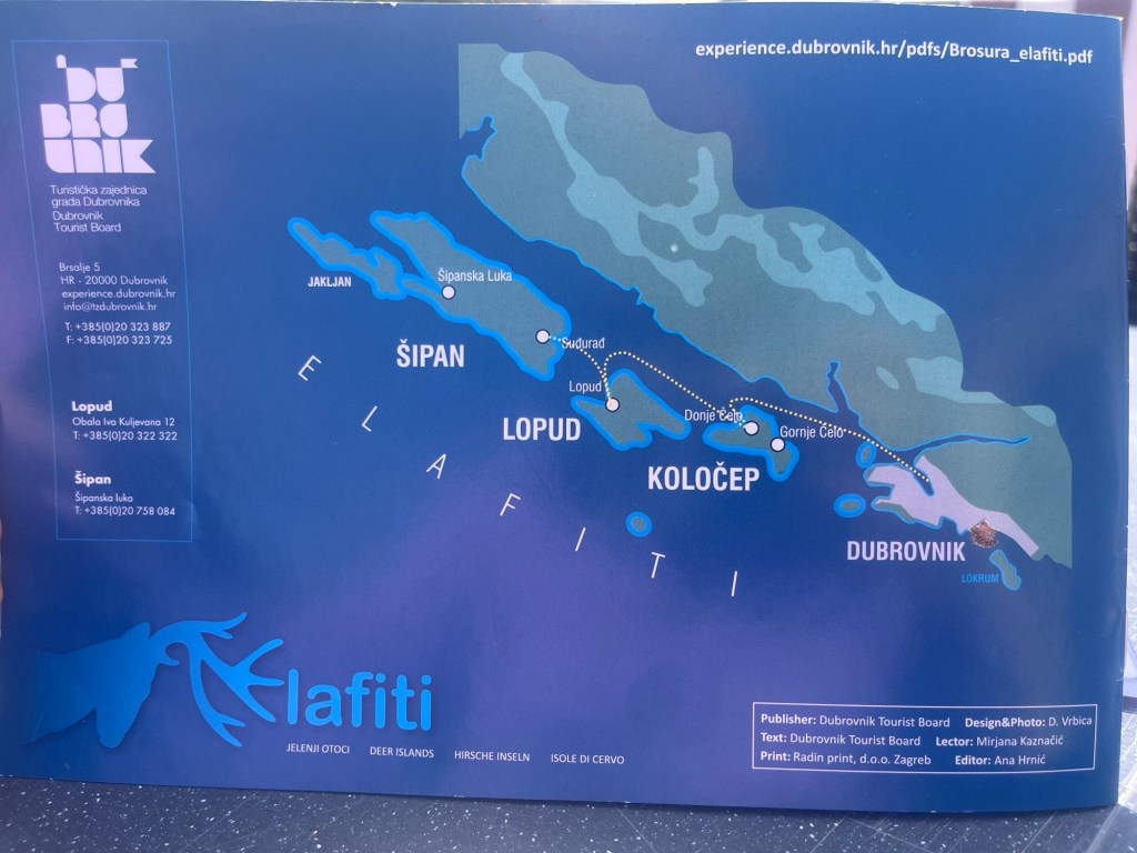 Kolocep is part of an archipelago of thirteen large and small islands known as the Elaphiti Islands (not pronounced like elephant!) that protect the Dubrovnik coast from offshore waves. According to the above brochure, these were the islands of Dubrovnik aristocrats, sailors and captains, fishermen, coral divers and farmers.